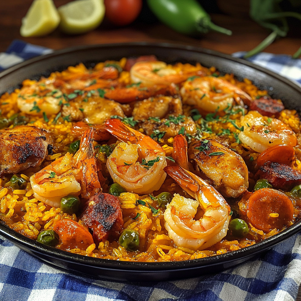 Bobby Flay Paella Recipe is a hearty and flavorful dish that brings the essence of Spanish cuisine to your dinner table. This vibrant meal features saffron rice, succulent chicken, juicy shrimp, and smoky chicken sausage, all cooked together in one pan. Perfect for family gatherings or special occasions, this dish not only satisfies hunger but also impresses with its rich flavors and colorful presentation.
